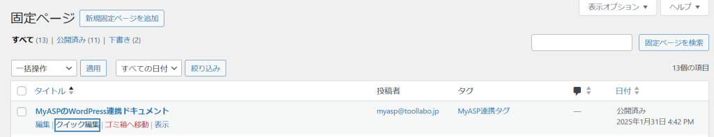・固定ページ一覧から、連携したい記事の「クイック編集」を行います