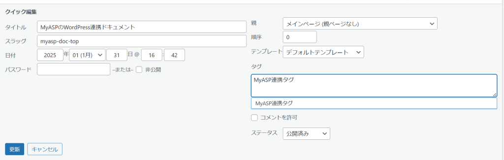 ・タグの一覧から「クイック編集」を選び「MyASP連携」を有効にします